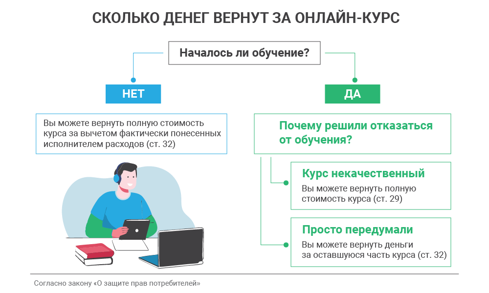 Верховный суд поддержал его позицию и указал, что суды руководствовались неправильной нормой права. Они признали, что курс содержал существенные недостатки, но применили ст. 32 закона «О защите прав потребителей», а она предназначена для случаев, когда потребитель отказался от договора при отсутствии нарушений со стороны исполнителя. Тогда ему возвращают деньги за ту часть курса, которую ученик не успел пройти. В рассматриваемом же деле истец имеет право полностью вернуть уплаченную сумму.